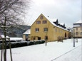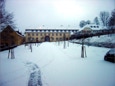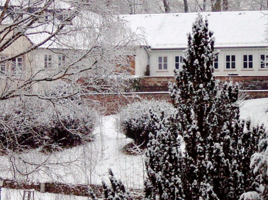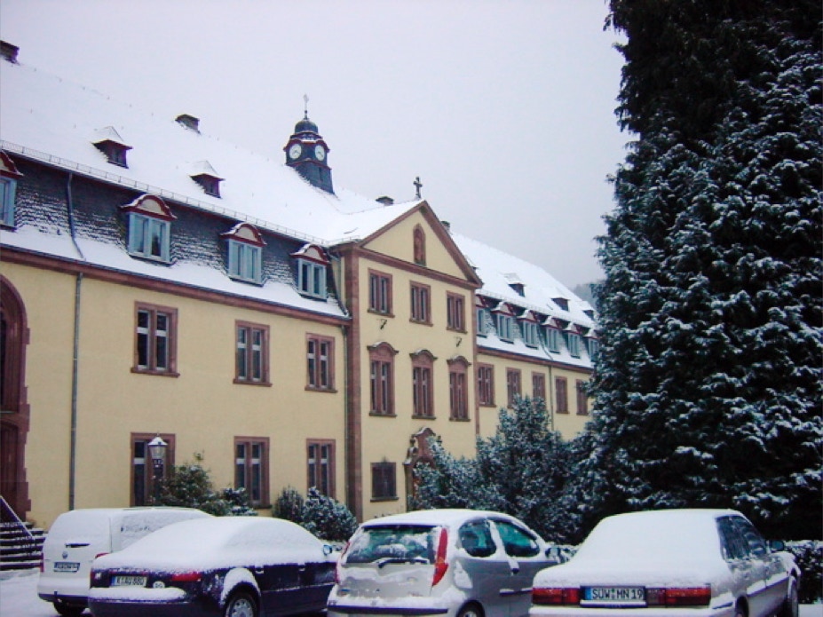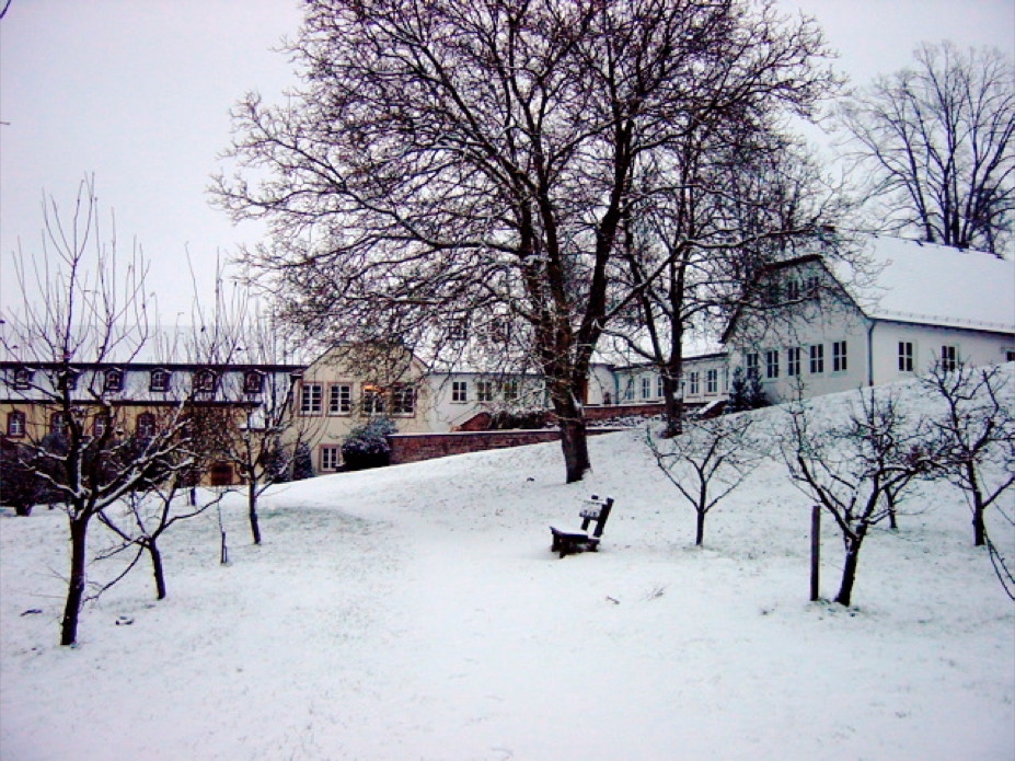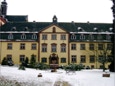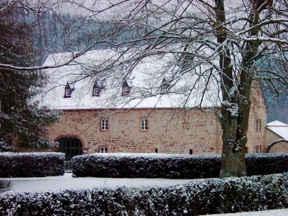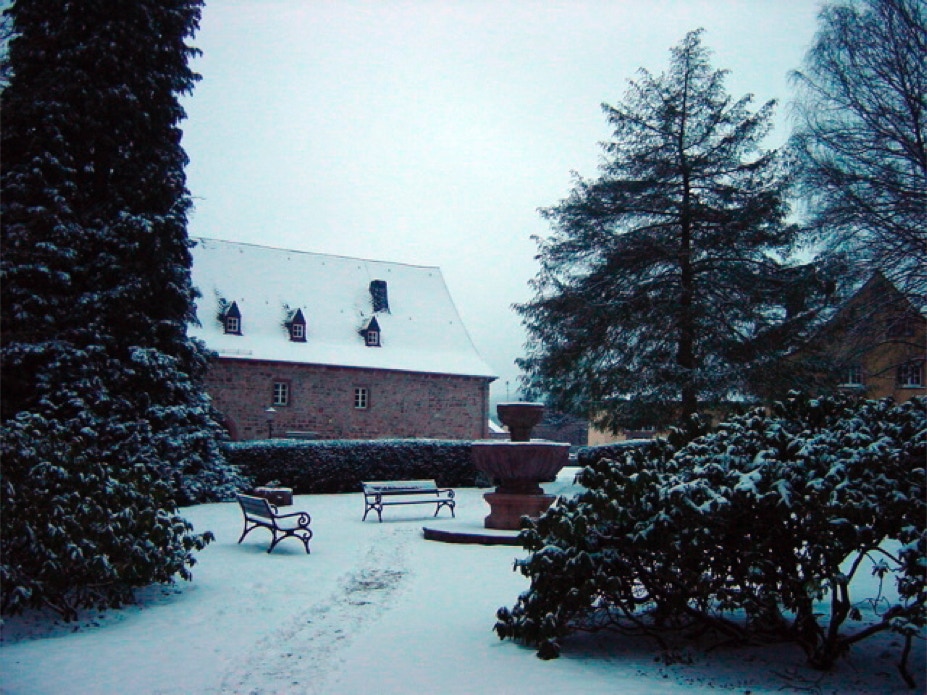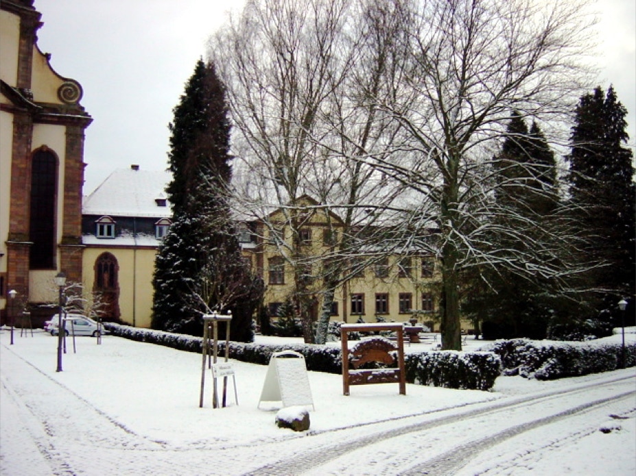 Blick vom Konventshaus über den winterlichen Klosterhof auf den vorderen Gästetrakt und die hoch gelegene Gaststätte.