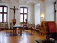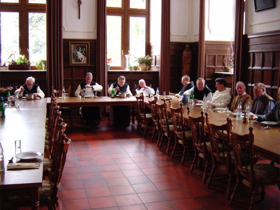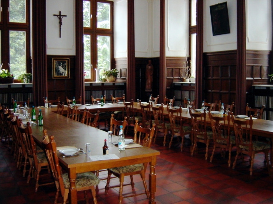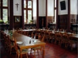 Das Refektorium. Hier nehmen die Mönche und männliche Gäste in den wärmeren Monaten die Mahlzeiten ein – unter Schweigen. Hinten rechts die Kanzel des Tischlesers, der während des Essens eine kurze Passage aus der Bibel, aus der Regel des heiligen Benedikt und dann aus einem aktuellen 'weltlichen' Sachbuch vorliest. Sonntags werden die Mahlzeiten von klassischer Musik begleitet.