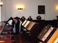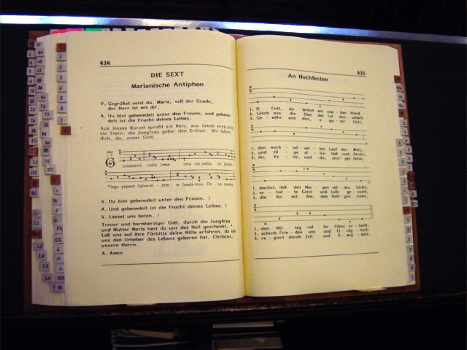 Die alten, noch mit schweren Messingbeschlägen und Schlössern versehenen Gebetsflolianten mit den Psalmen und Hymnen in lateinischer Sprache, die zur Vesper und Komplet benutzt werden.