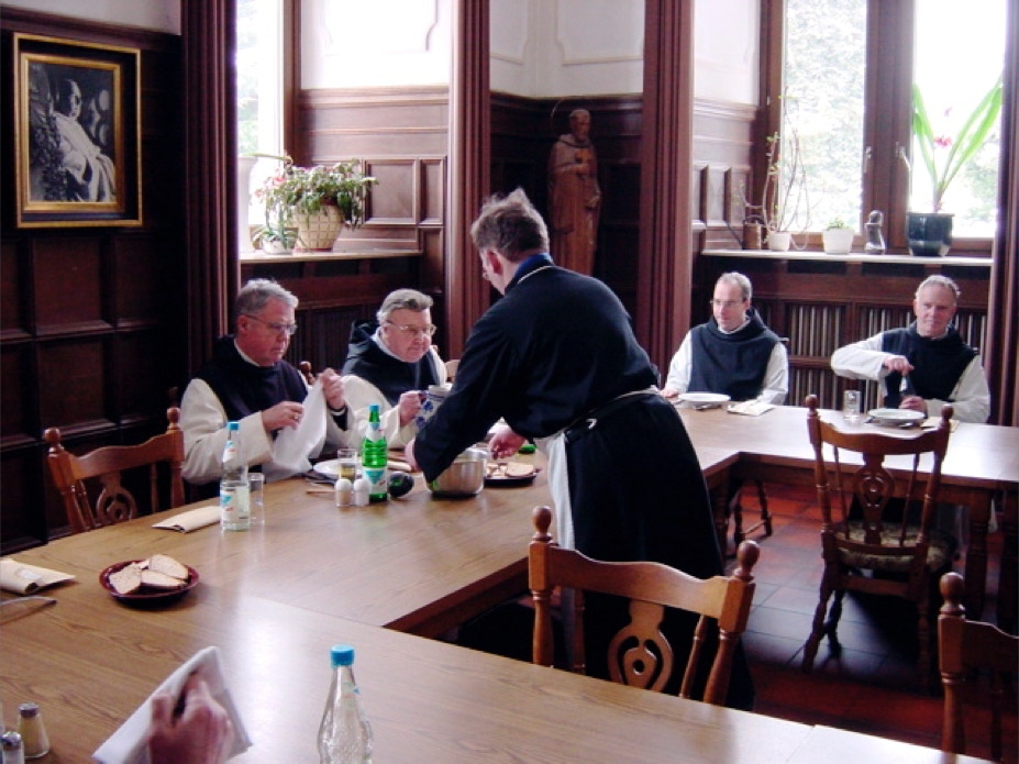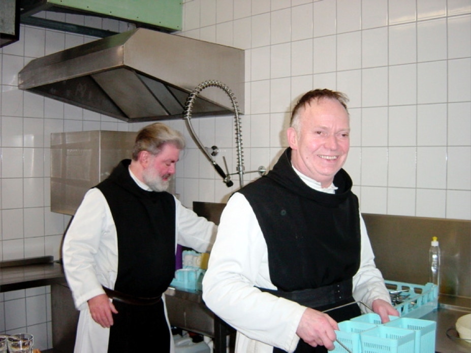 Abwechselnd übernehmen Jeweils zwei Mönche für eine Woche den Tisch- und den Vorlesedienst. Während im Parlatorium schon die Suppe verspeist wird, richtet hier der Novize Peter die Schüsseln für das Hauptgericht vor, das er gleich auftragen wird. Tischdienst und Vorleser essen hinterher allein. Das vorzügliche Essen kommt aus der Klostergaststätte.
