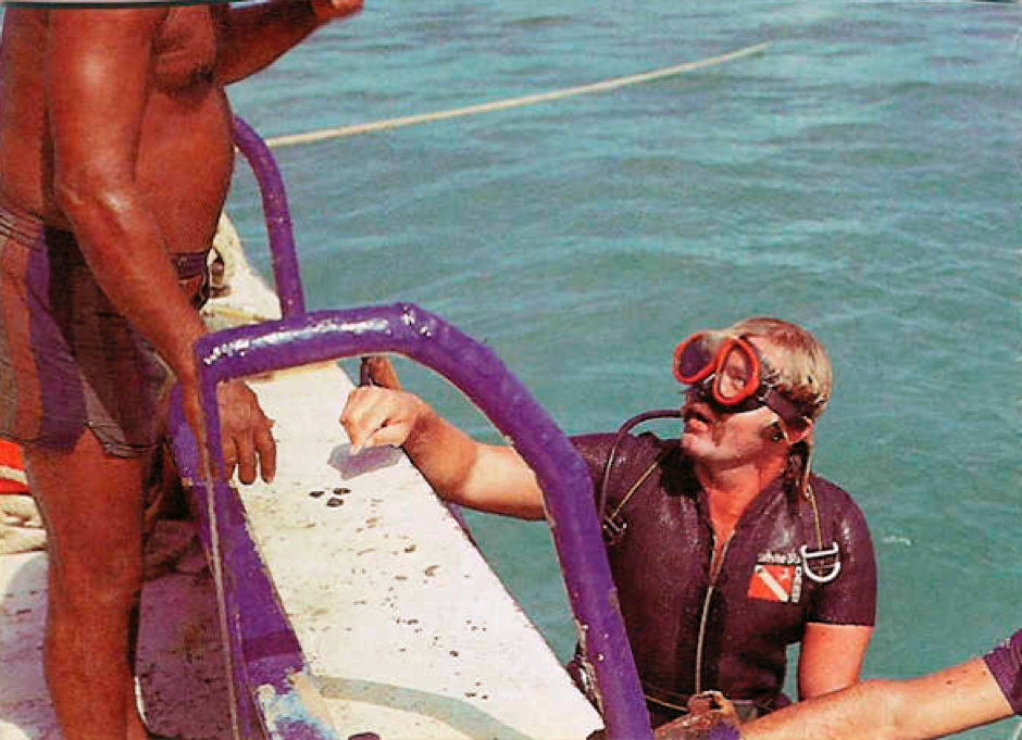 1981: Nach einem erfolgreichen Tauchgang auf hoher See bergen RMS und ein Taucherfreund fünf Golddublonen und eine Goldbrosche vom Meeresboden - und obwohl das Gold seit dreieinhalb Jahrhunderten versunken lag, sehen Münzen und Brosche wie neu aus!