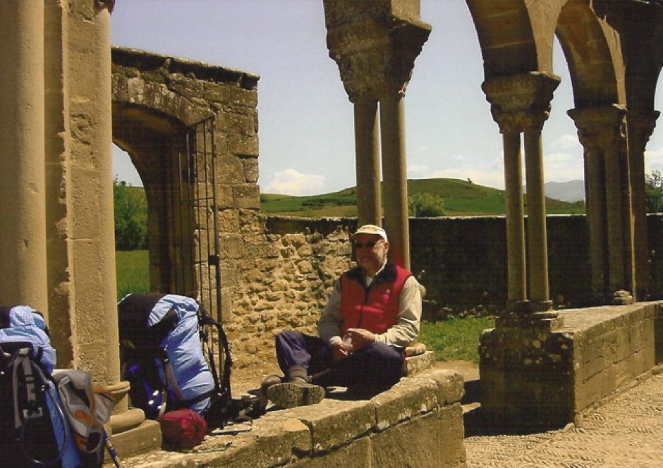 Rast im Kreuzgang der Templer. Rast vor der Templer-Kirche in Eunate, Nordspanien.