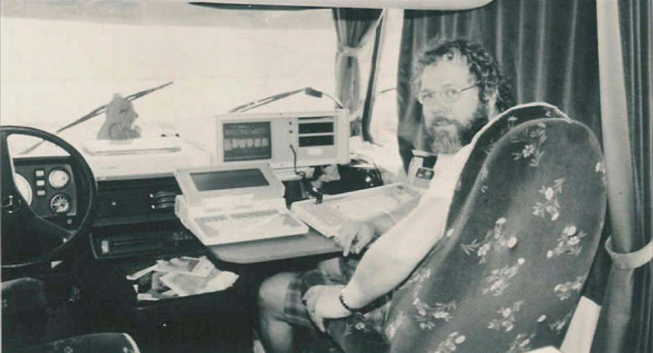 1987: Die Beifahrerseite des Motorhomes wurde während der Reise zu einem rollenden Arbeitszimmer mit der – damals – modernsten Technik. Tagsüber gemachte Interviews wurden nachts, während der Fahrt zum nächsten Ort, schon in den Computer geschrieben.