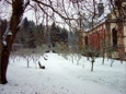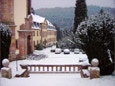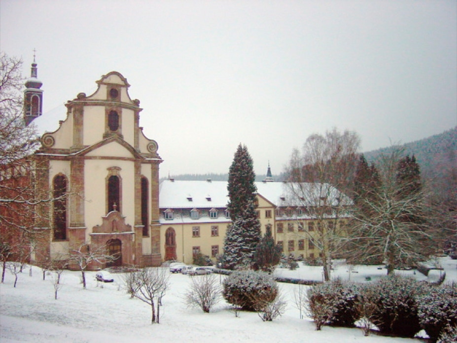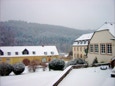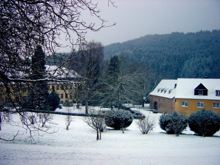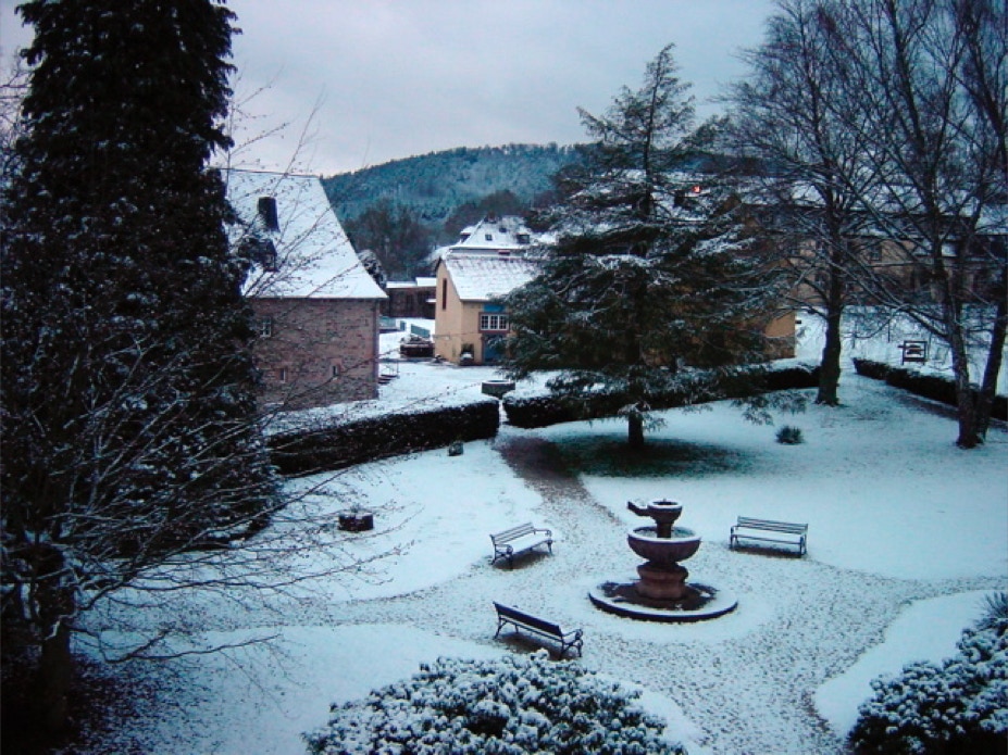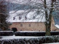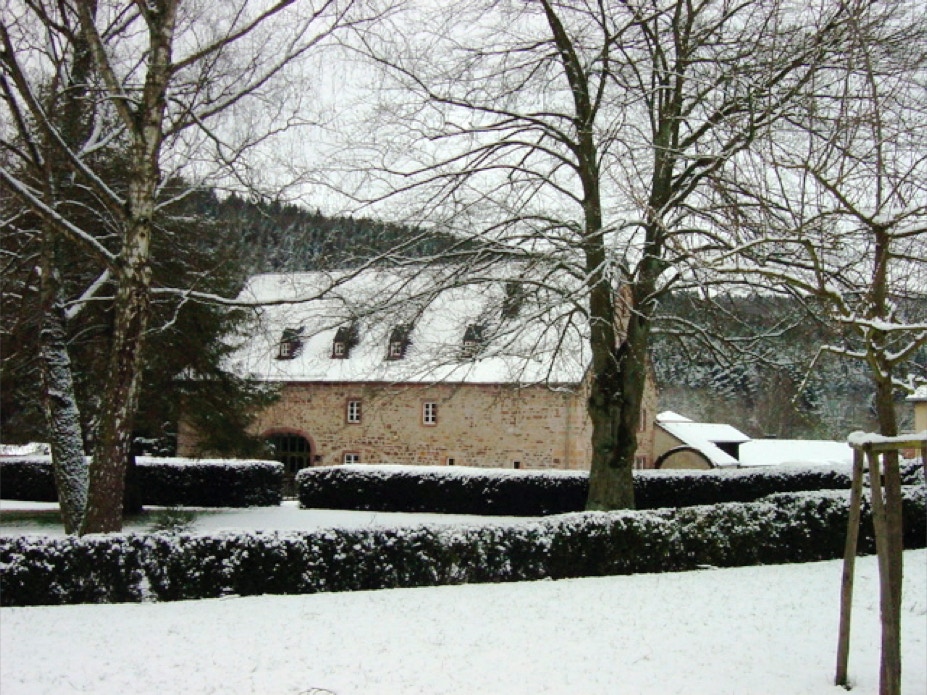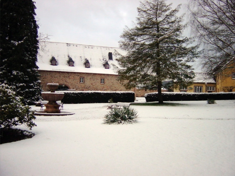 Blick vom Konventshaus über den winterlichen Klosterhof auf den vorderen Gästetrakt und die hoch gelegene Gaststätte.