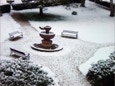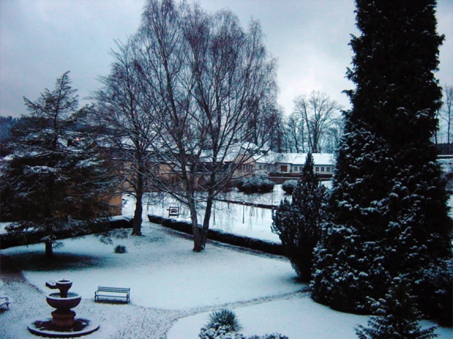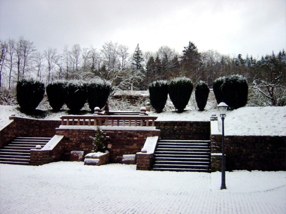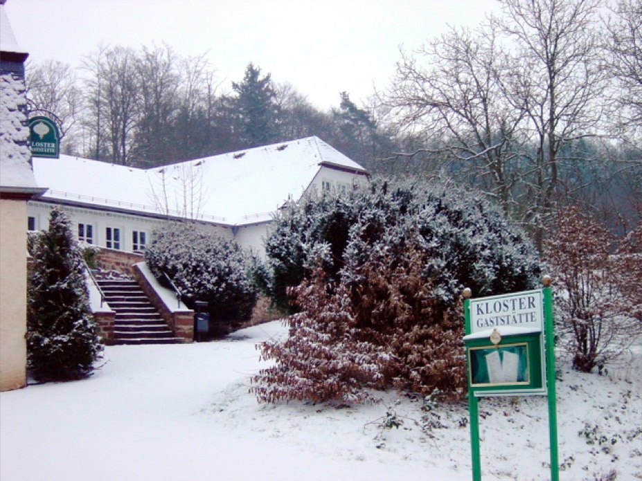 Die im Winter verwaiste Sonnenterrasse der Klostergaststätte.