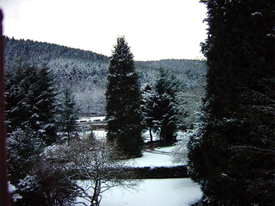Die verschneite Abtei aus Osten von jenseits der Salm.