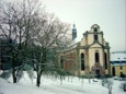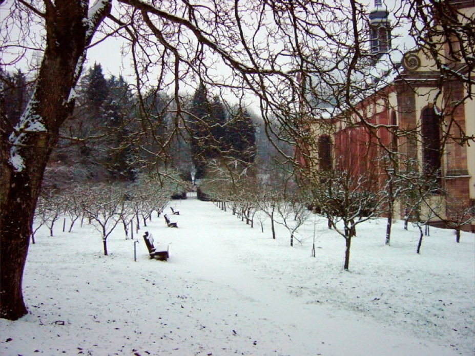 Blick durch den winterlichen Obsthain auf die Abteikirche.