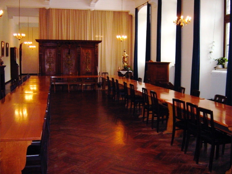 Das Refektorium. Hier nehmen die Mönche und männliche Gäste in den wärmeren Monaten die Mahlzeiten ein – unter Schweigen. Hinten rechts die Kanzel des Tischlesers, der während des Essens eine kurze Passage aus der Bibel, aus der Regel des heiligen Benedikt und dann aus einem aktuellen 'weltlichen' Sachbuch vorliest. Sonntags werden die Mahlzeiten von klassischer Musik begleitet.