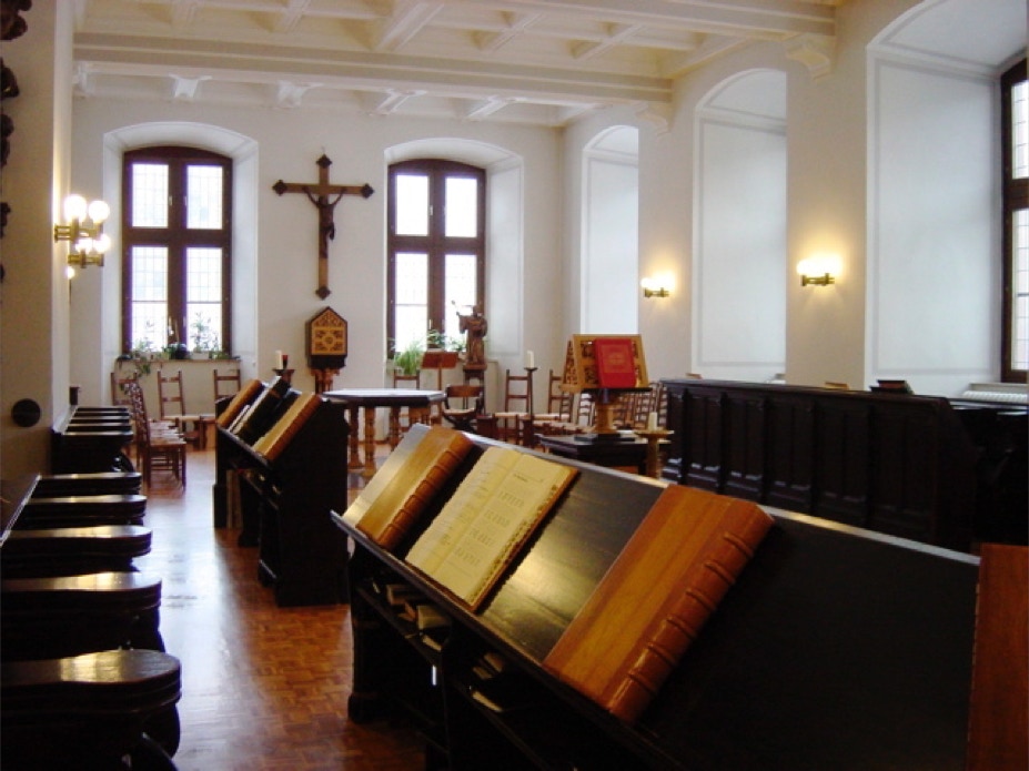 Das Oratorium, in dem die Gebetszeiten der Vigilien, Laudes, Terz, Sext und Non abgehalten werden und im Winter auch die Messe. Blick vom Chorgestühl auf den Altarraum.