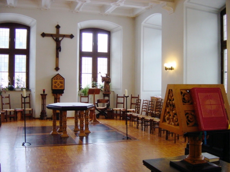 Der Altarraum im Oratorium. Rechts und links Stuhlreihen für Gäste.