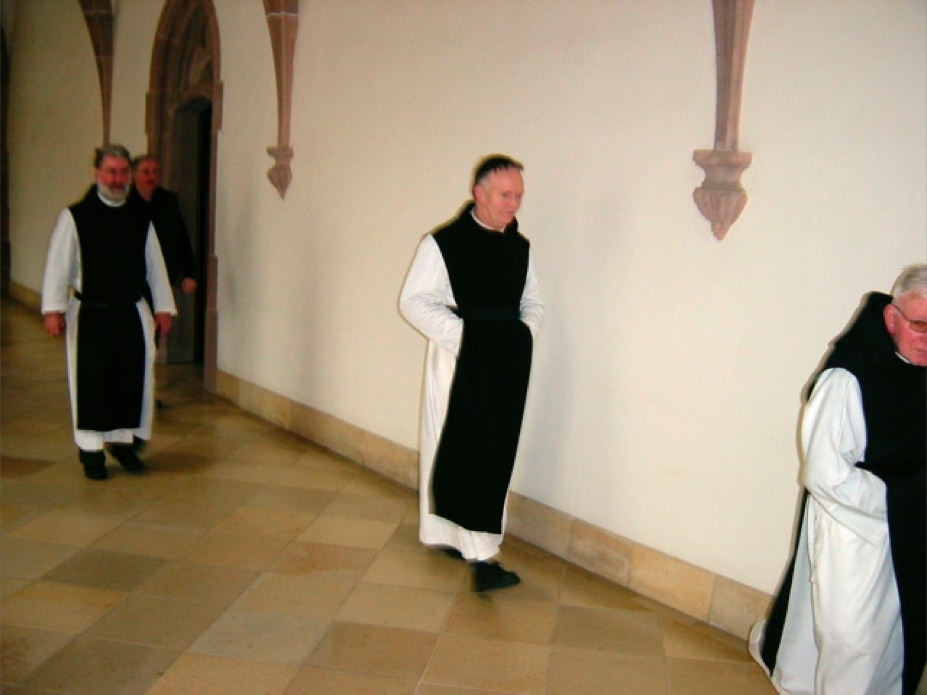 Mönche im Kreuzgang nach der Sext auf dem Weg zum Mittagessen.
