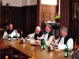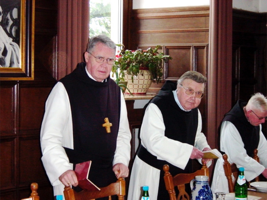 Abt Bruno Fromme – bereit, das Tischgebet vor dem Essen zu sprechen. Rechts von ihm Pater Ludger.