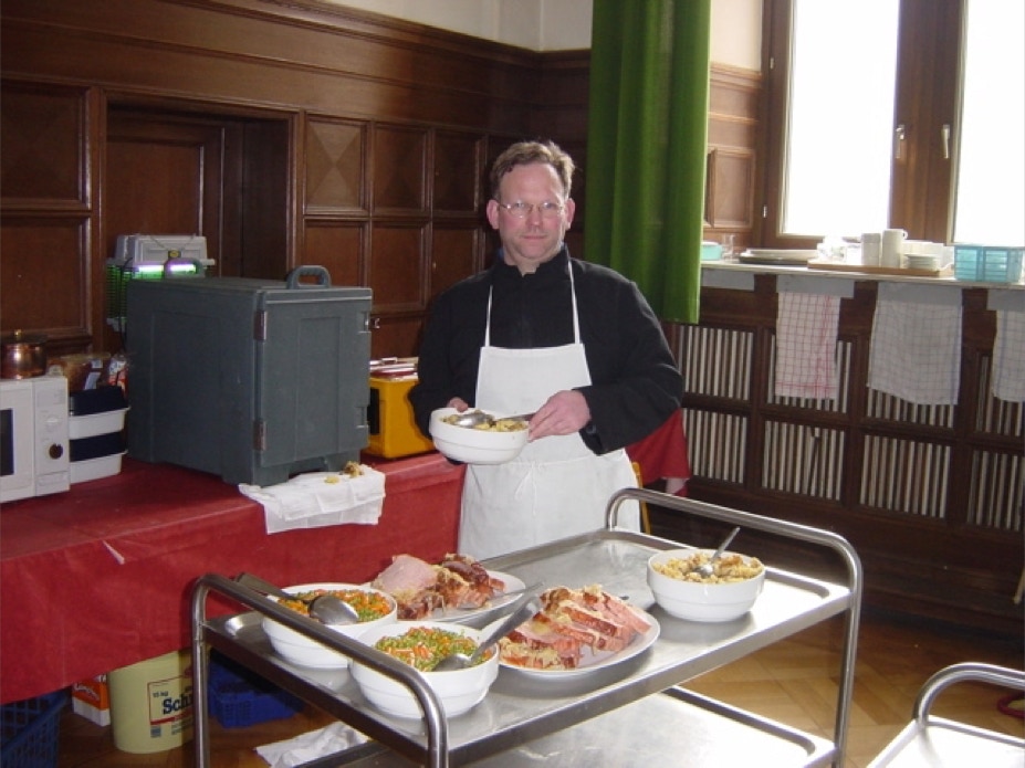 Abwechselnd übernehmen Jeweils zwei Mönche für eine Woche den Tisch- und den Vorlesedienst. Während im Parlatorium schon die Suppe verspeist wird, richtet hier der Novize Peter die Schüsseln für das Hauptgericht vor, das er gleich auftragen wird. Tischdienst und Vorleser essen hinterher allein. Das vorzügliche Essen kommt aus der Klostergaststätte.