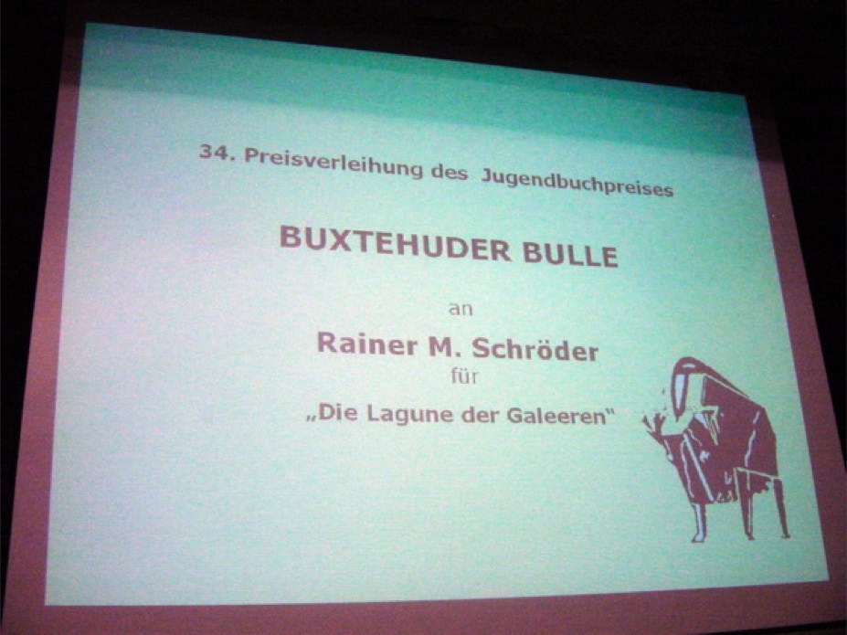 RMS mit der 26 Pfund schweren Stahlplastik "Buxtehuder Bulle", der ihm 2005 für seinen Roman "Die Lagune der Galeeren" verliehen wurde.