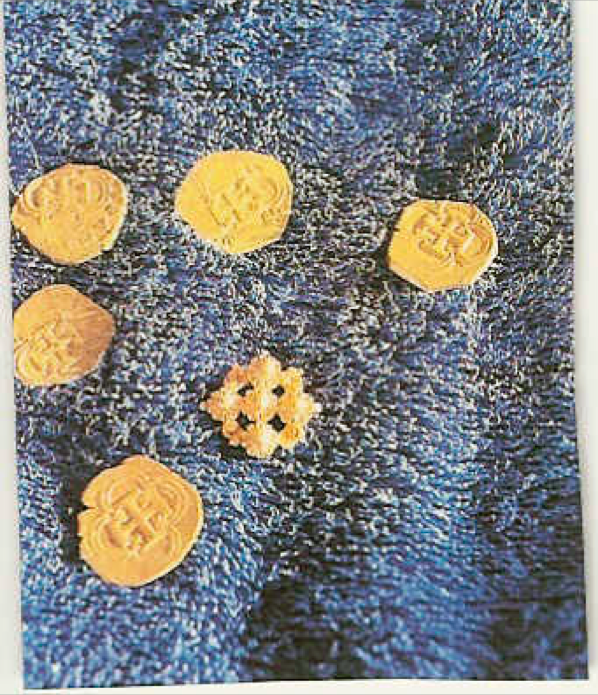 1981: Nach einem erfolgreichen Tauchgang auf hoher See bergen RMS und ein Taucherfreund fünf Golddublonen und eine Goldbrosche vom Meeresboden - und obwohl das Gold seit dreieinhalb Jahrhunderten versunken lag, sehen Münzen und Brosche wie neu aus!