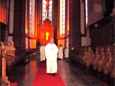 Feierlicher Einzug der Mönche zur abendlichen Vesper und Komplet, vorweg der Vater Abt Bruno. Rechts und links das altehrwürdige, geschnitzte Chorgestühl.