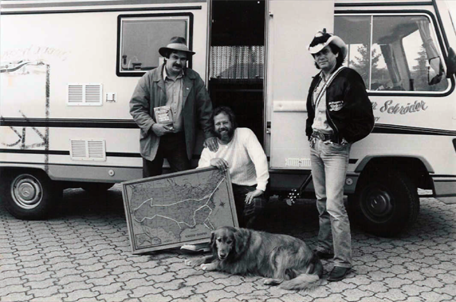 1987: RMS (Mitte) mit Co-Autor Thomas Jeier (links) und Country-Sänger Tom Astor (rechts) nach Rückkehr von einer 9monatigen Recherchenreise durch die USA für das Sachbuch "Das große Buch der Trucker". Die weißen Linien auf der Karte zeigen die Route an, die RMS mit seiner Frau Helga und Golden Retriever Ben in diesen 9 Monaten gefahren sind. Das deutsche Motorhome wurde vorher per Frachter nach USA verschifft.
